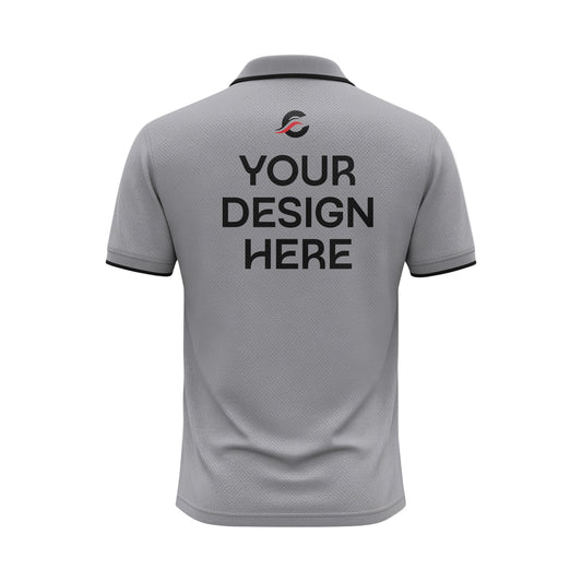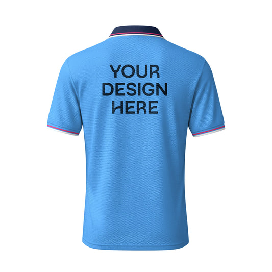 কাস্টমাইজযোগ্য লাইট ব্লু ব্যাক ডিজাইন মেশ পোলো টি-শার্ট – 170 GSM | নিজের লোগো ও টেক্সট পেছনে যোগ করুন