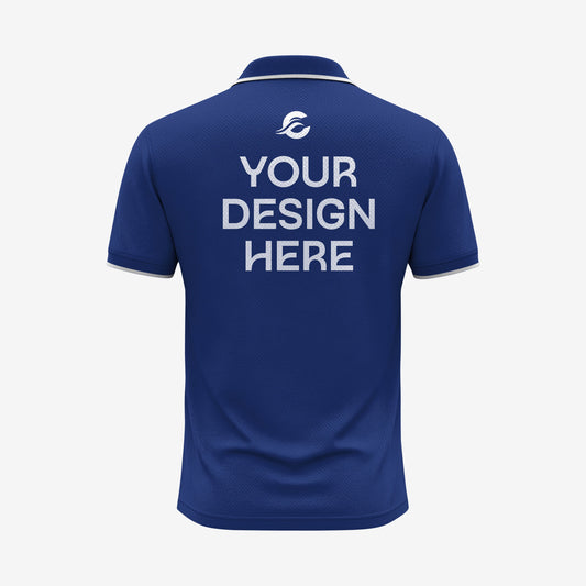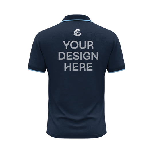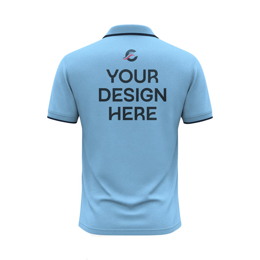 কাস্টমাইজযোগ্য লাইট ব্লু ব্যাক ডিজাইন মেশ পোলো টি-শার্ট – 170 GSM | নিজের লোগো ও টেক্সট পেছনে যোগ করুন